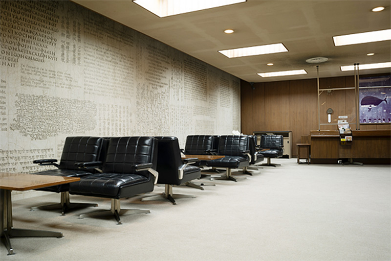 古今東西の文字を壁面に刻んだ「人類の文字」がお出迎え。