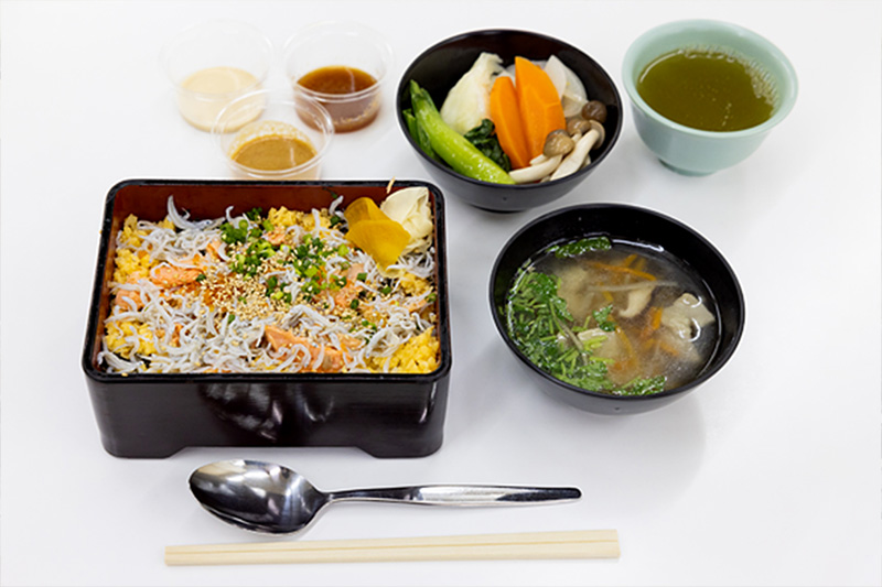 この日のメニューは鮭しらす重と豚汁で、温野菜には3種のドレッシング付。驚きの200円です!